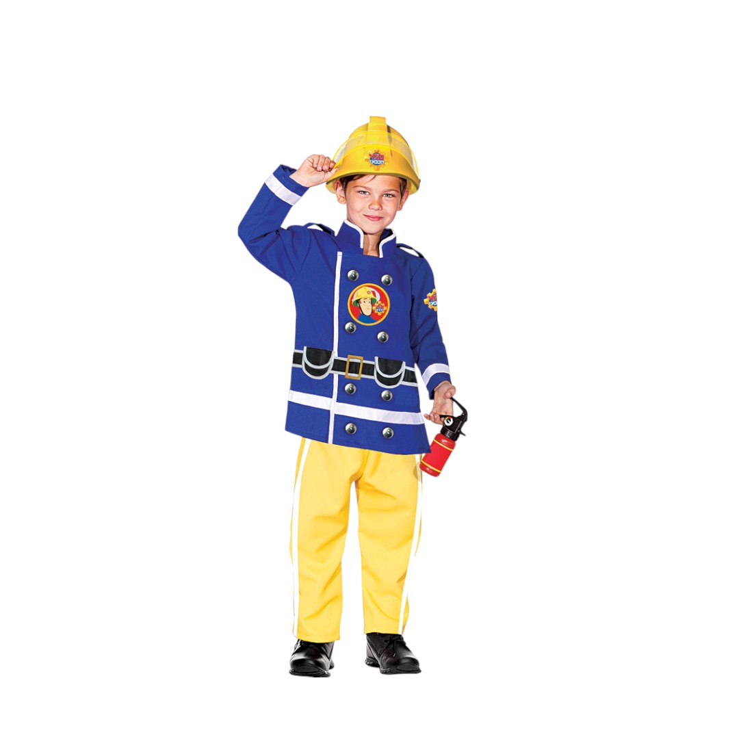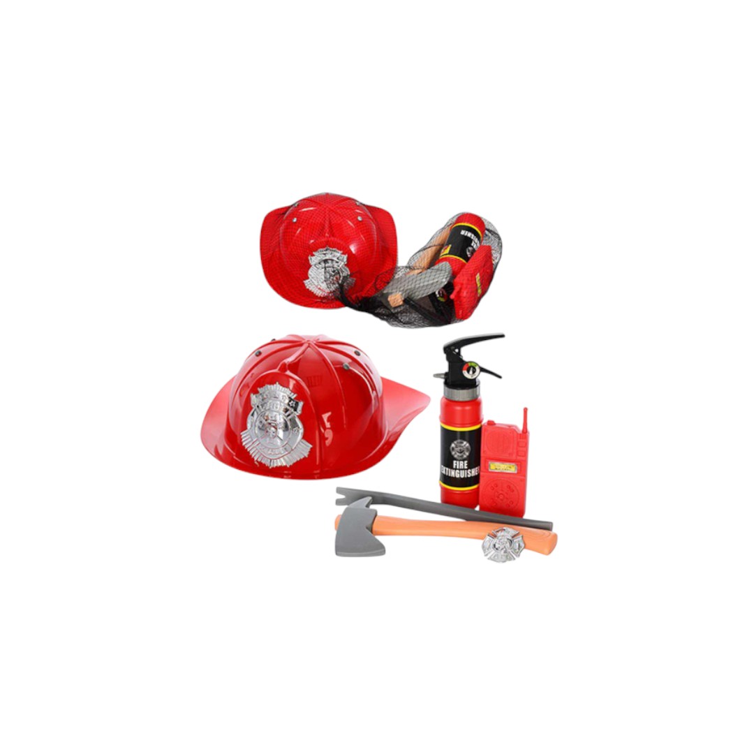 סט לכבאי כולל כובע, מטף כיבוי, מכשיר קשר, גרזן, תג ולום ברשת