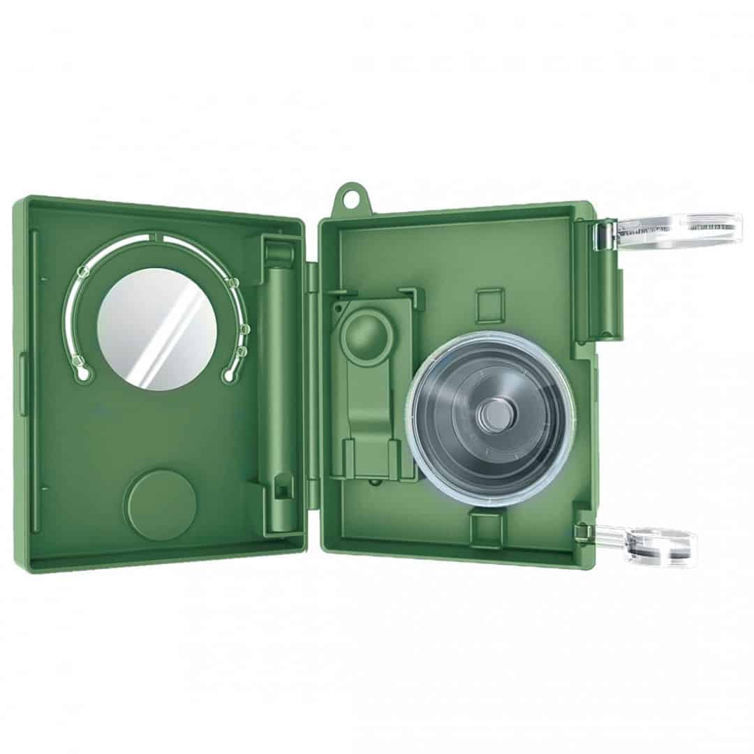 תכולה: 1x מכסה תבה (9 X 11 X4.5 ס”מ), 1x גוף תבה, 1x גוף המשרוקית, 1x תוספת משרוקית, 1x מראה, 1x שעון שמש זקוף, 1x פנס (כולל 1 X סוללת כפתור מסוג V CR12203), 1x מכסה מטהר, 1 X טבעת גדולה למטהר, 1 X טבעת בינונית למטהר, 1 X בסיס למטהר, 1 X תמיכה לעדשות גדולות, 1 X עדשות גדולות, 1 X ציר עדשות, 1 X מצפן, 1 X תמיכה לעדשות קטנות, 1 X עדשות קטנות, 12 X מרקר והוראות מפורטות. רוחבה של התבה לאחר הרכבה הוא 12 ס”מ.